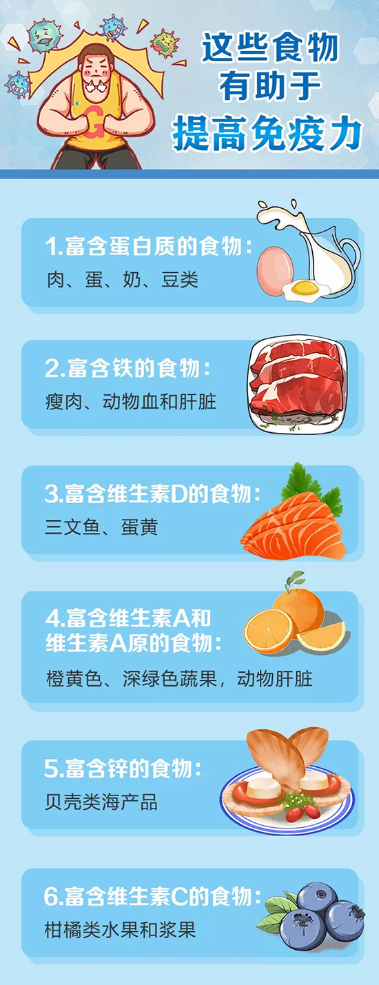 保证蛋白质的摄入。蛋白质不仅可以为免疫细胞、抗体和黏膜组织的再生修复提供原料,还可以与碳水化合物协同作用,促进机体的修复。建议每日摄入瘦肉、鱼、 虾、蛋、奶、大豆等优质蛋白类食物,尽量保证每天 1 个鸡蛋,300 克奶及奶制品。
