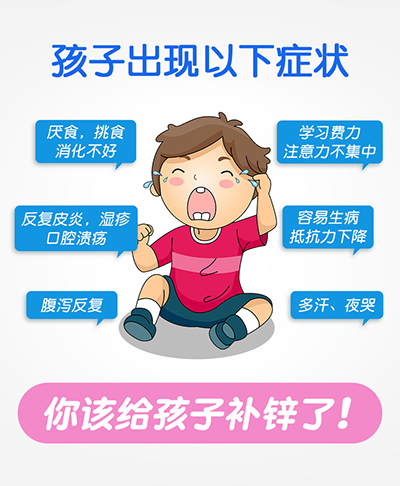 世界卫生组织2013年的数据显示,5岁以下的儿童中,有超过1/4发育迟缓与缺锌有关。缺锌的宝宝容易造成生长发育缓慢,还可能出现味觉减退、食欲不振、贫血、创伤愈合不良、免疫功能低下等症状。